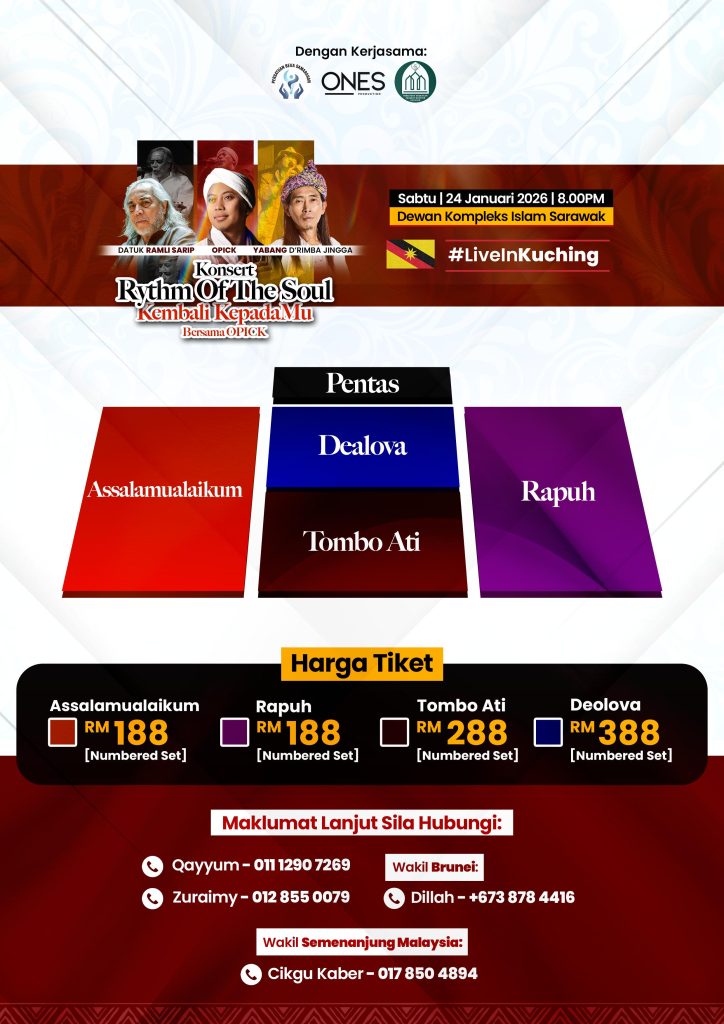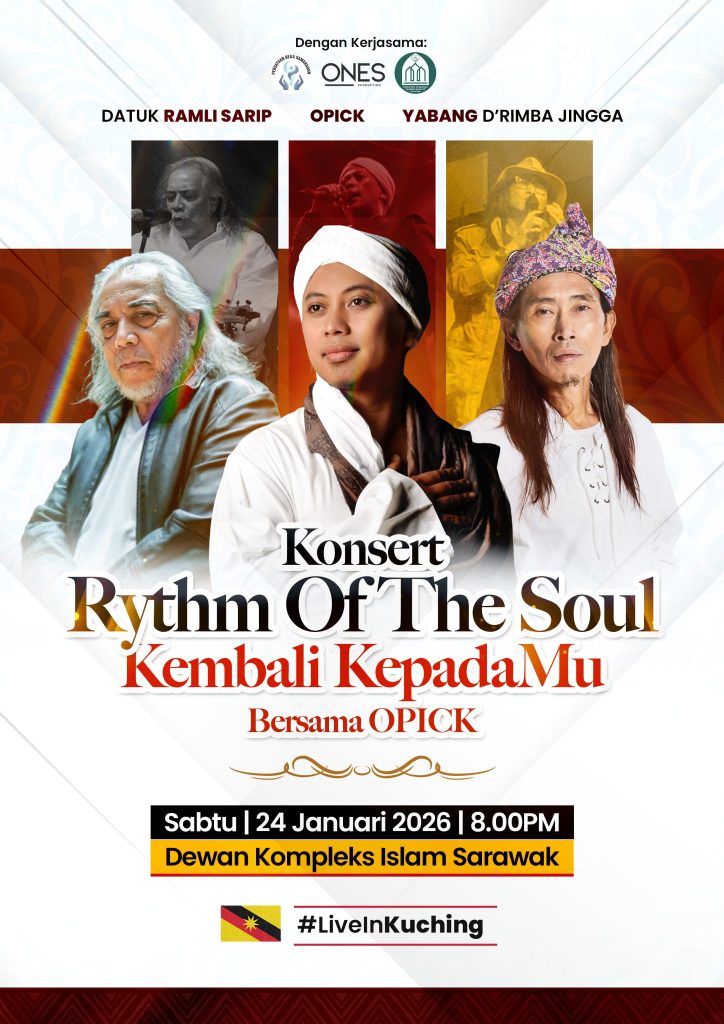 Pada 24 Januari 2026, Kuching bakal disinari dengan sebuah malam penuh makna dan syahdu melalui Konsert Rhythm Of The Soul “Kembali KepadaMu” bersama Opick, bertempat di Dewan Majma Tuanku Abdul Halim Mu’adzam Shah (Kompleks Islam Sarawak).